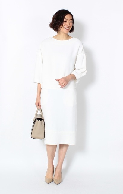 ワンピースは、袖ありで単品でも着用しやすいです。色は、ホワイトの他にネイビーもご用意。コンパクトでミニマルなデザインで年齢も選ばず着用いただけます。素材の厚みも適度にあり、シルエットも体のラインをひろいにくくなっております。是非、店頭またはONLINE SHOPで商品ご覧になってみてください。