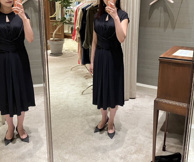 エレガントなスタイリングに定評があり、小柄なお客様からリアルな着丈のバランスが参考になると信頼されています。そんな彼女が着たのはこちら。