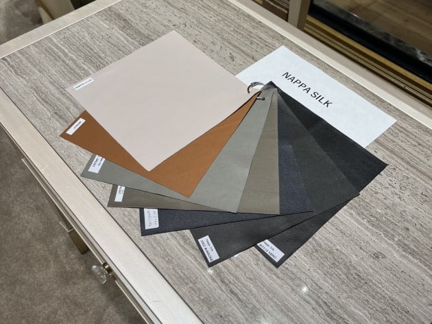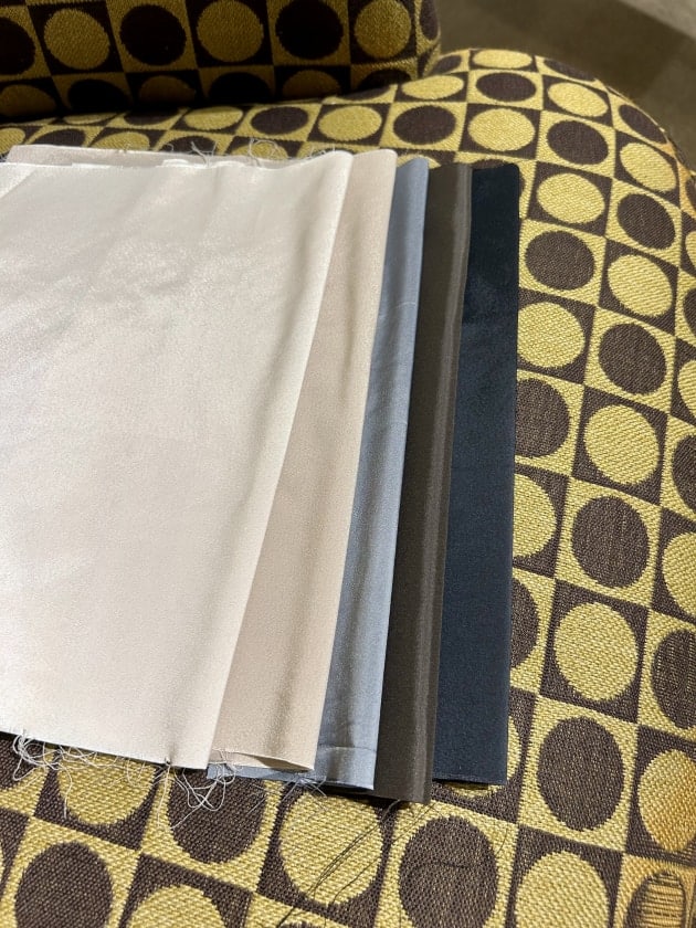パープルのリネン素材の方は裏地なし。植田が手に持っているブラックはベージュの裏地付きです。