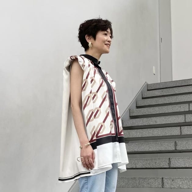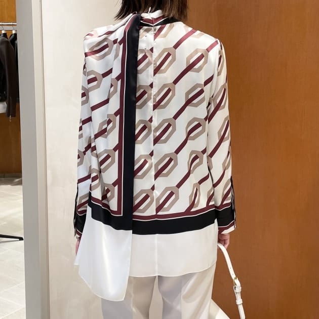 濃紺のブラウスには明るいボトムスを合わせたくなりますね。真っ白も素敵です。