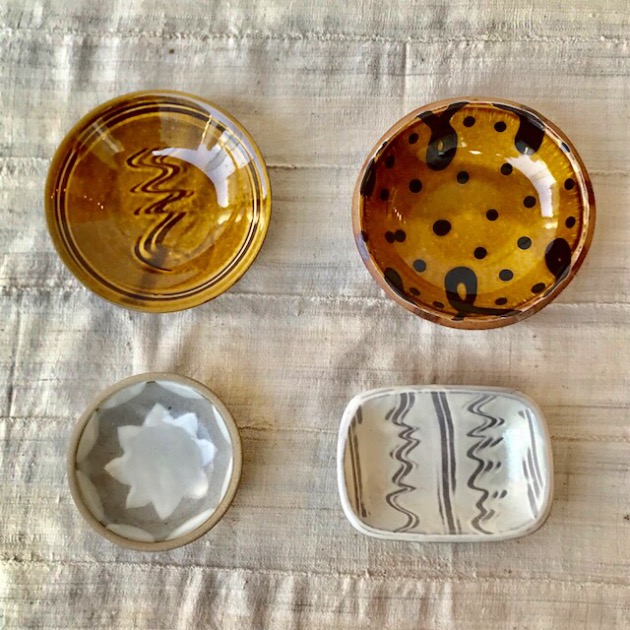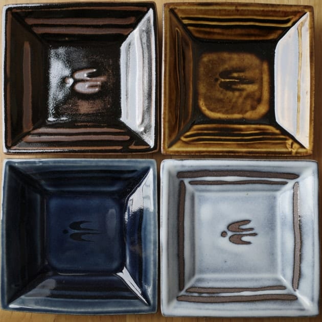 <延興寺窯>の代表的な釉薬、黒釉・飴釉・瑠璃釉・白釉はそのままに、縁の指描きや、つばめの表現が洗練された印象です。
