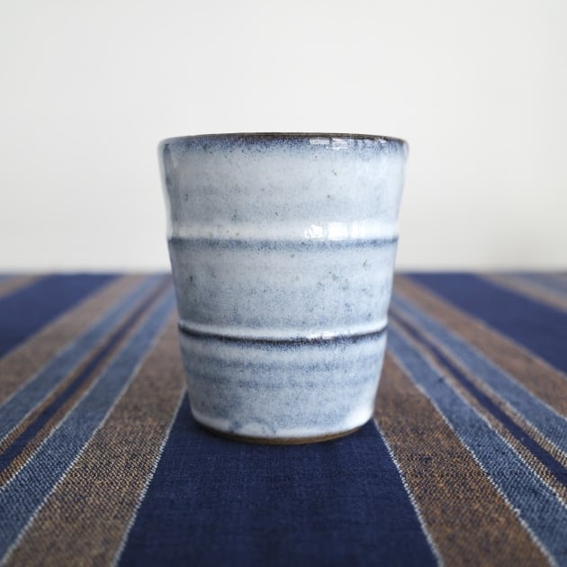 二つの筋が入ったビアカップ。たっぷりと入る大きさですが、筋が指に掛かり持っていただきやすい形です。海鼠釉の柔らかで奥行きのある色目が美しい。