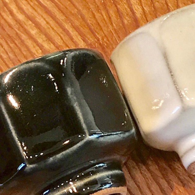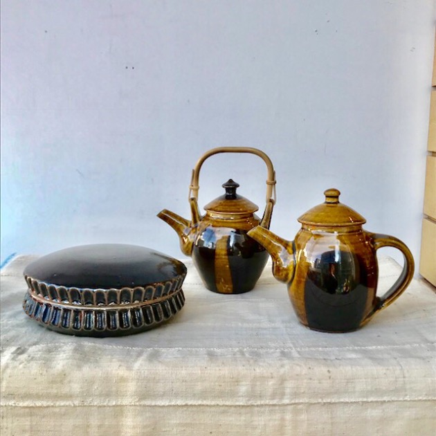 端正な表情の片口。櫛描きがリズミカルに入った飴釉、シンプルに釉薬が掛けられた静かな白釉とが揃います。