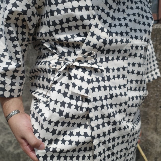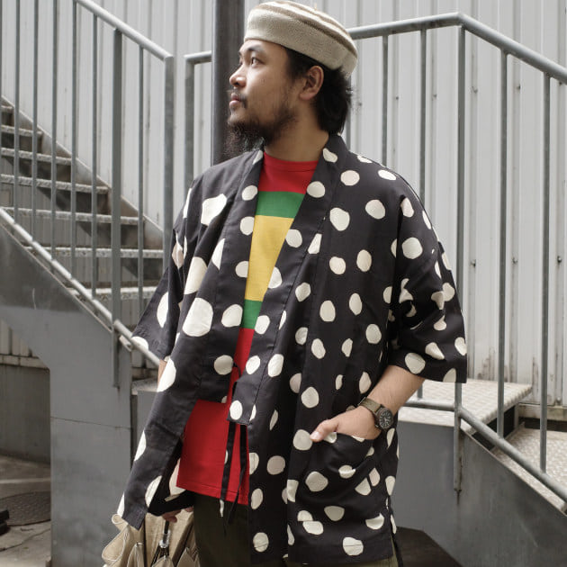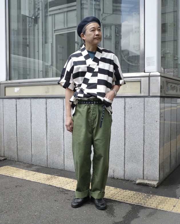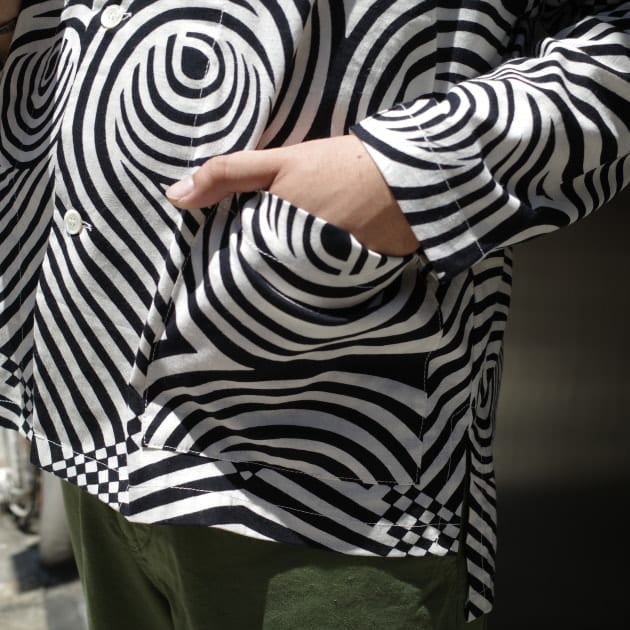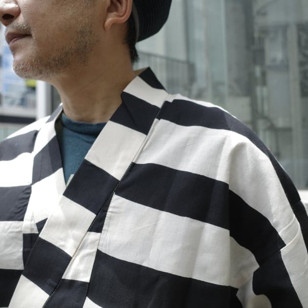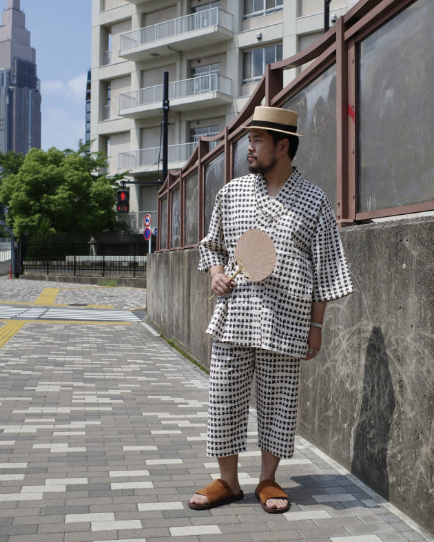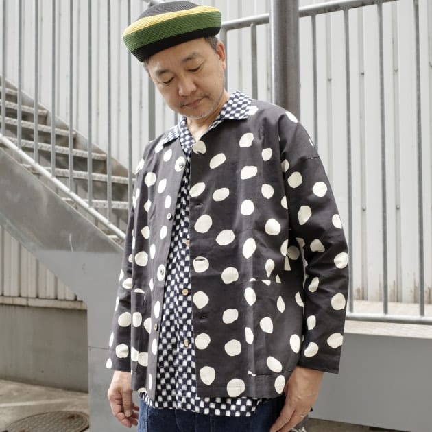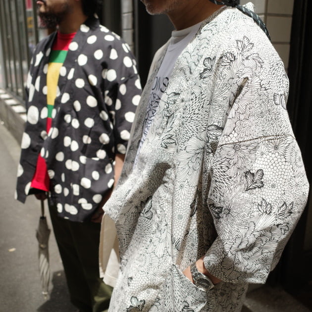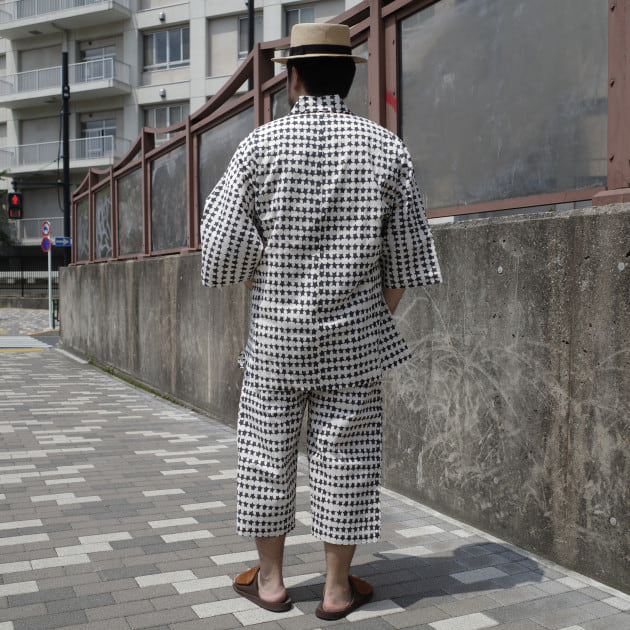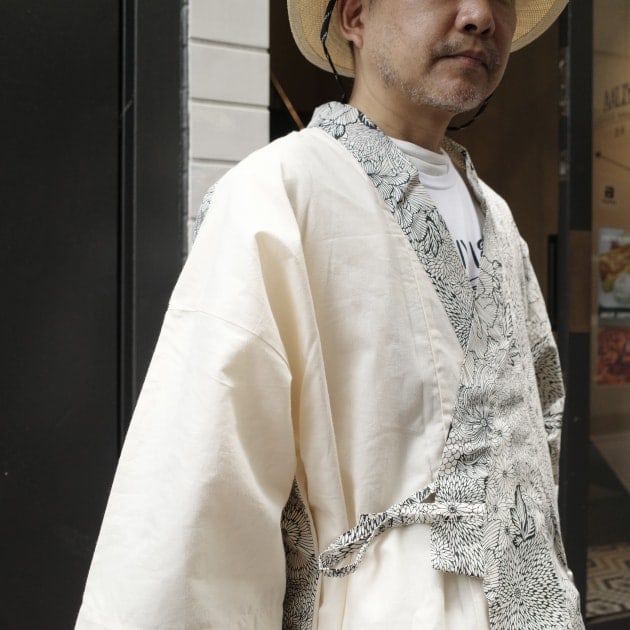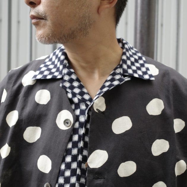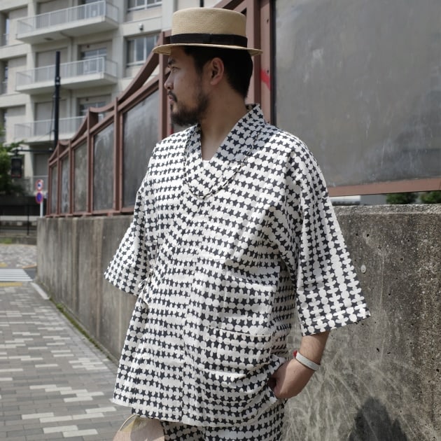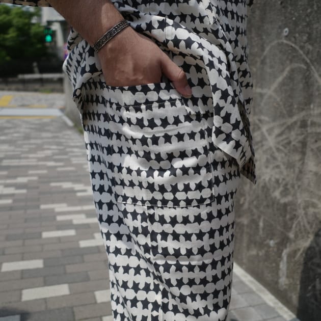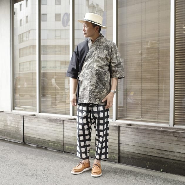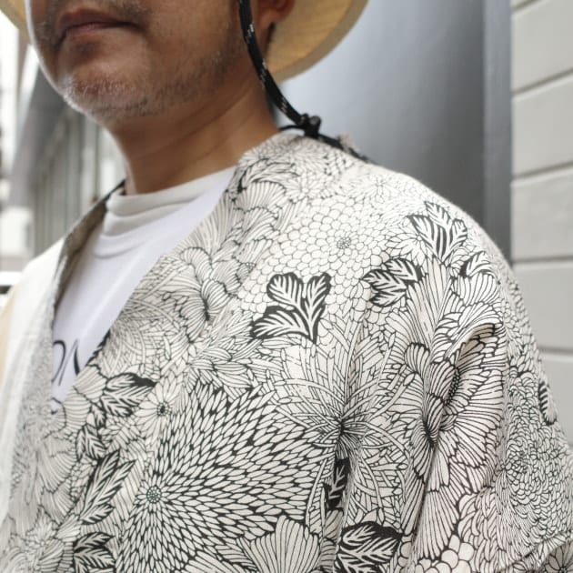 甚平は単一でも楽しんでいただけるように別々のアイテムとしてご用意しているので、こういった柄物のシャツとの組み合わせもお試しいただきたいです。