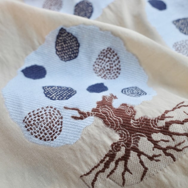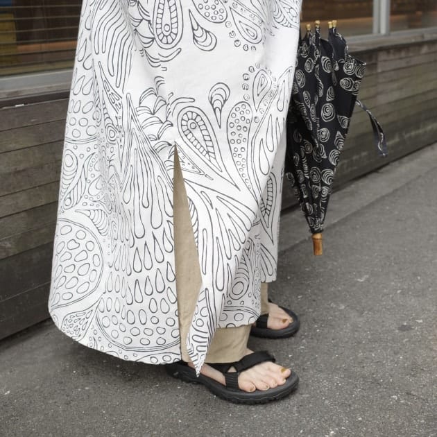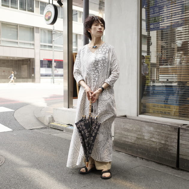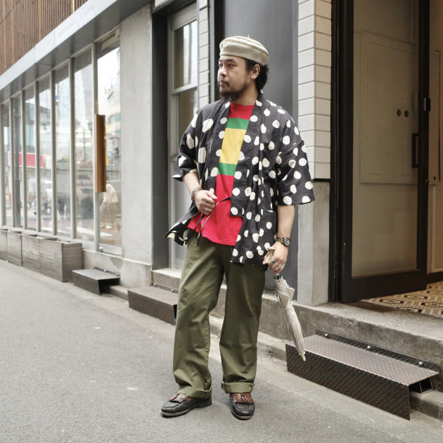 <傳tutaee>オリジナルの注染は、祭りのためのウェアとは見えず、いつものスタイリングにプラスするとファッションとして楽しいアイテムに。