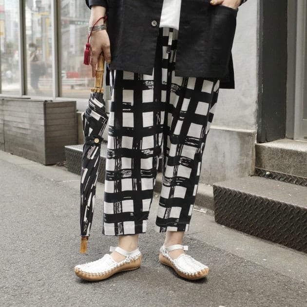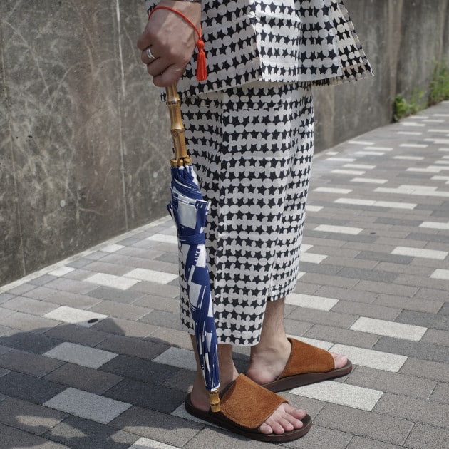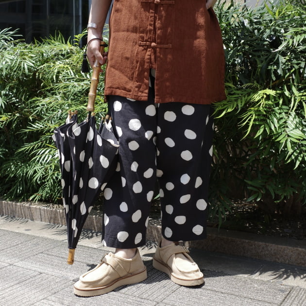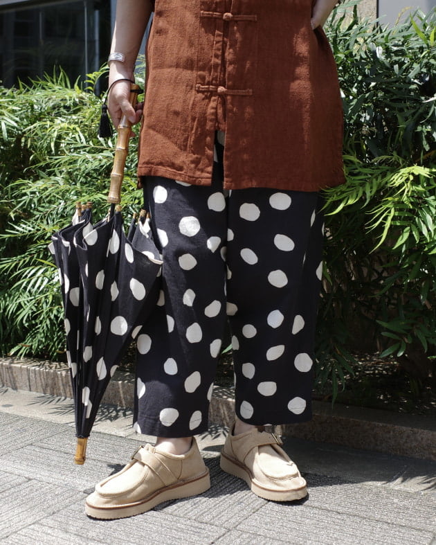 スリットからは同じ注染で仕立てた“STETEKO”を覗かせています。こんなスタイリングも楽しいですよね。