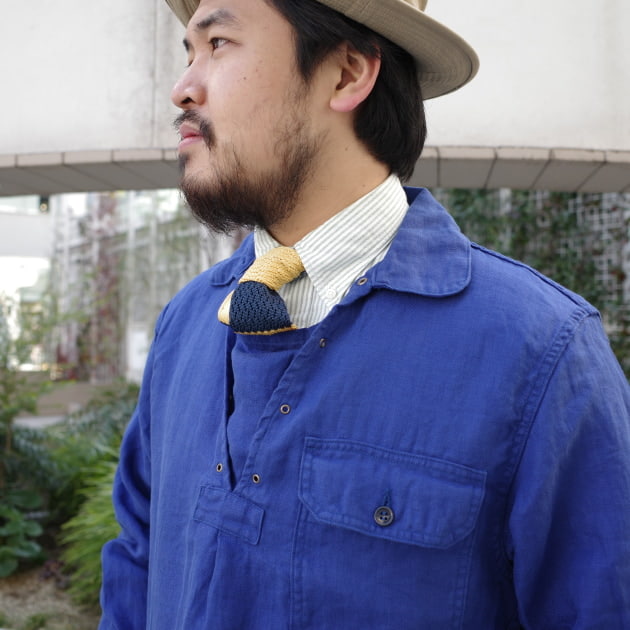 2024年春夏シーズンのLOOKでは、<TATAMIZE>のハットと久留米絣で製作した<fennica>オリジナルアロハシャツ、足元は<DOEK>のキャンバススニーカーでスタイリング。