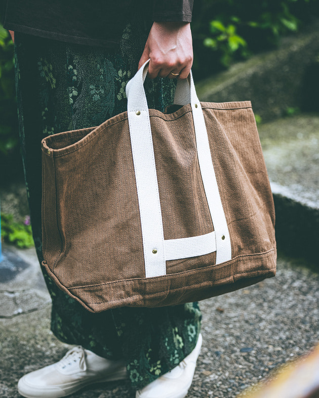 生地の糸はボディに淡色のBROWN × CLOUD、ポケットは濃色のBROWN × CHOCOの色目を使用。春夏シーズンの藍染めや泥染めとはまた違った表情で楽しむことができます。