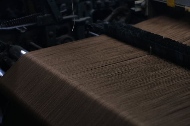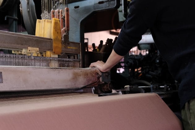 今現在製造されていない貴重なシャトル織機を使用して織り上げる生地は、手織りのようにゆっくりと丁寧に時間を掛けることで、表面に凹凸が生まれ、ふっくらとあたたかみある表情になります。