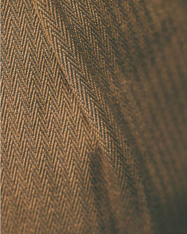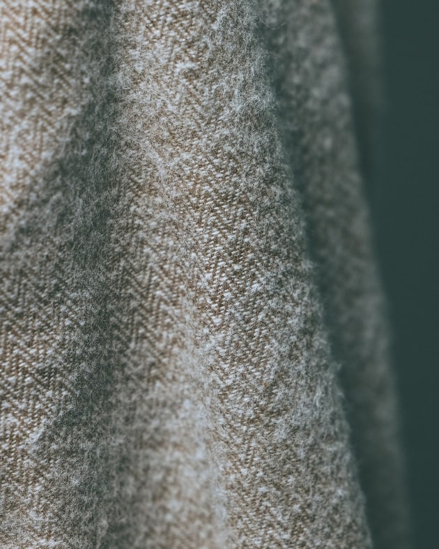 こちらのヘリンボーン生地は、糸の本数を減らして生地の密度を小さくし、緯糸に空紡糸を使用することで硬さが削ぎ落とされ、洋服として仕立てた際に柔らかで肌馴染みの良い素材に仕上がっています。