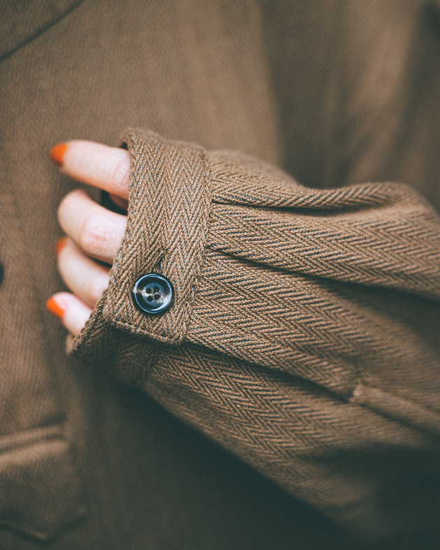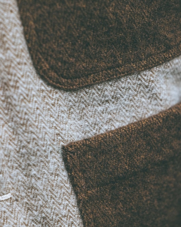 こちらのジャケットに使用したヘリンボーン生地は、経糸が綿、緯糸がウールのリバーシブル。経糸は全てのアイテムに共通して太い糸を双糸にして強度を持たせています。本来綿糸は、短繊維の集まりで糸が切れやすく糊付けで補強するのですが、この工程が不要になるため糊剤もそれを落とす大量の水を使わずに済みます。環境へ配慮したモノづくりの姿勢が伺えますね。