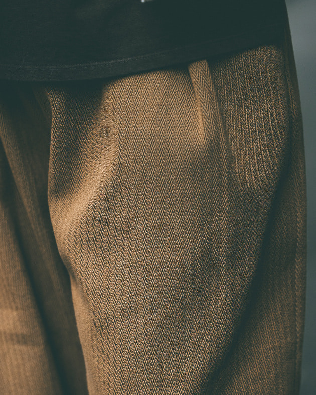 新たにお披露目する“Easy Pants”は、“French Court Work Jacket”と合わせた際にバランスの良いパンツとして、ボリュームを持たせたシルエットで製作。深めに入ったインプリーツもポイントです。