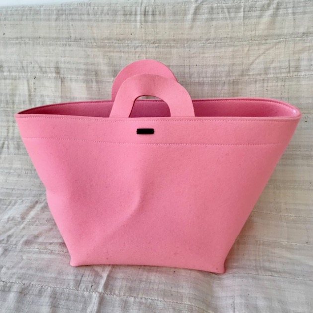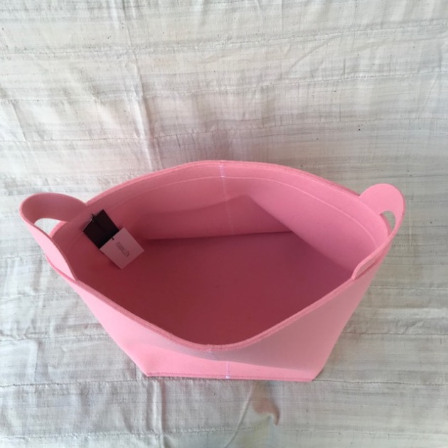 横に持ってきても良し、です。かなり大きめのサイズでまちも広い作りです。素材がフェルトですので重いものを入れて持ち歩くのには強度の面であまりお勧めしませんが、インテリアとしてマガジンラックにしたり、玩具入れにしたり、それこそスリッパを入れるのにも向いているのでは。