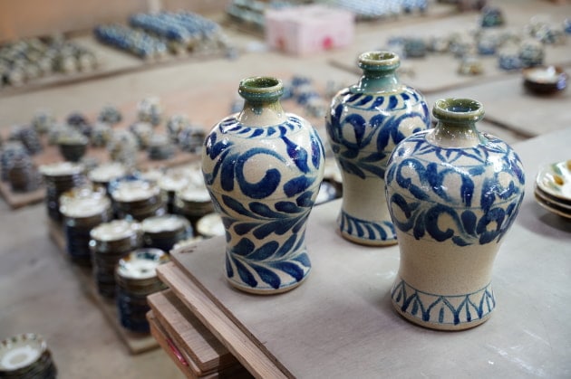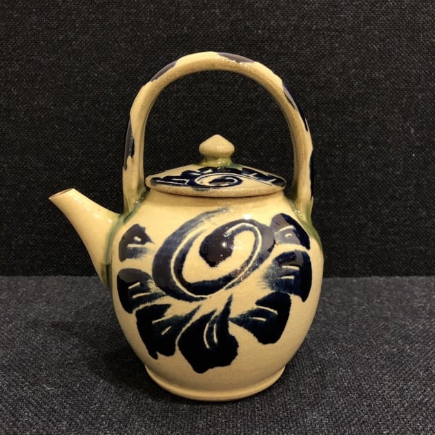 化粧度を打ち付けてから透明釉を掛け、乾燥させた後、筆や藁、手を使ってコバルト釉を打ち付けています。