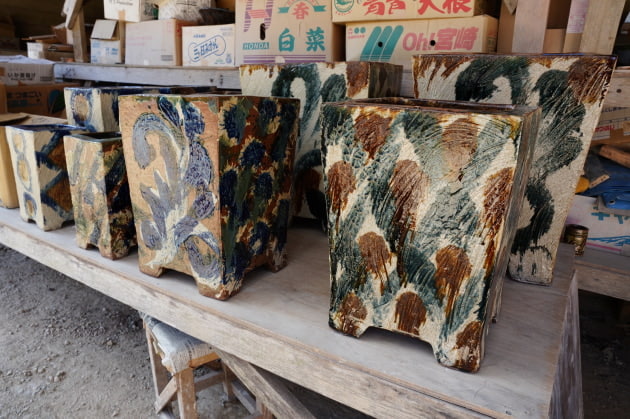 現代において力ある厨子甕を作ることのできる陶工は多くありません。共司さんは厨子甕特有の伝統的な形だけでも残したいと、厨子甕の屋根を取り、四角いフォルムを活かした切立ちを作るようになったといいます。