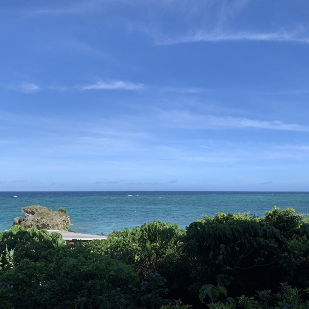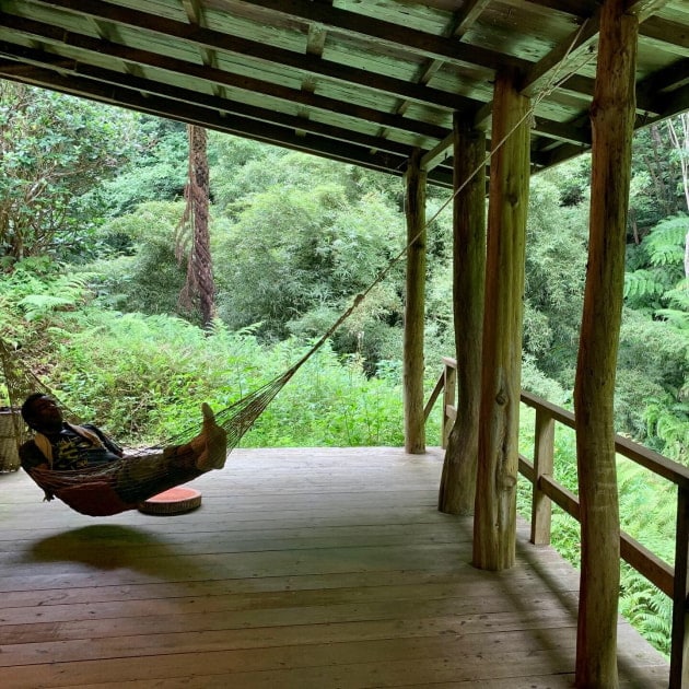 採れたての海と山の幸を使った郷土料理がいただける、ふたりのお気に入りの宿。裏山には草木が青々と生い茂っています。