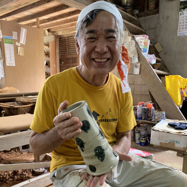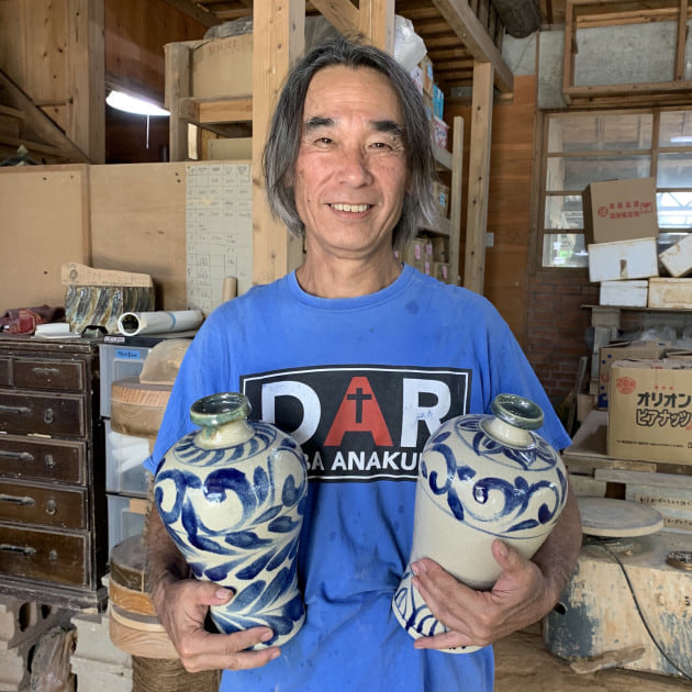 こちらは赤土で作ったピッチャーに白土の化粧を施しているところ。やちむんというと、おおらかな絵付けに目を奪われますが、この真っ白でない、あたたかみのあるクリーム色がやちむんらしく、また、絵付けを引き立てます。