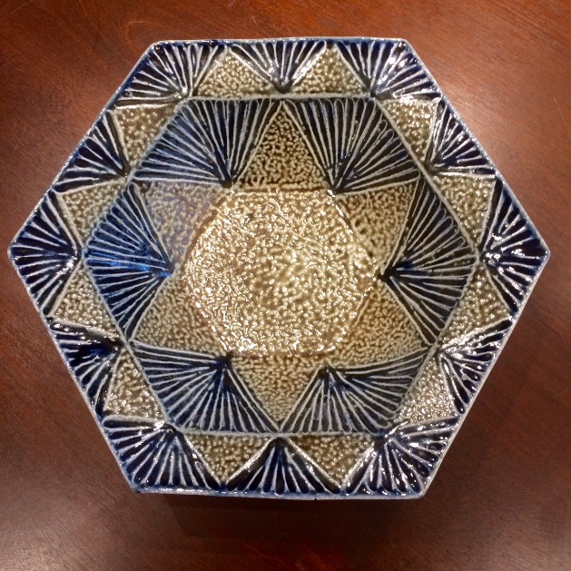 糖白釉に胴を混ぜたものが青釉ということで相性の良い釉薬なのですが、青釉の上に糖白釉を重ねると馴染んで発色しないのだそう。蝋でマスキングすることでこのようなコントラストが生まれるんですね。