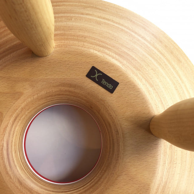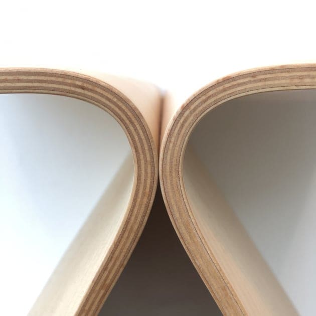 同じ形状の成形合板3枚を、金具を使わずに、チークの木目がぴたりと中心で合うよう組み合わせた造形で、スツールやサイドテーブル、重ねればシェルフとしてと、非常にフレキシブルなデザインです。