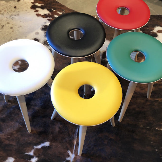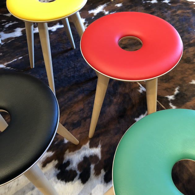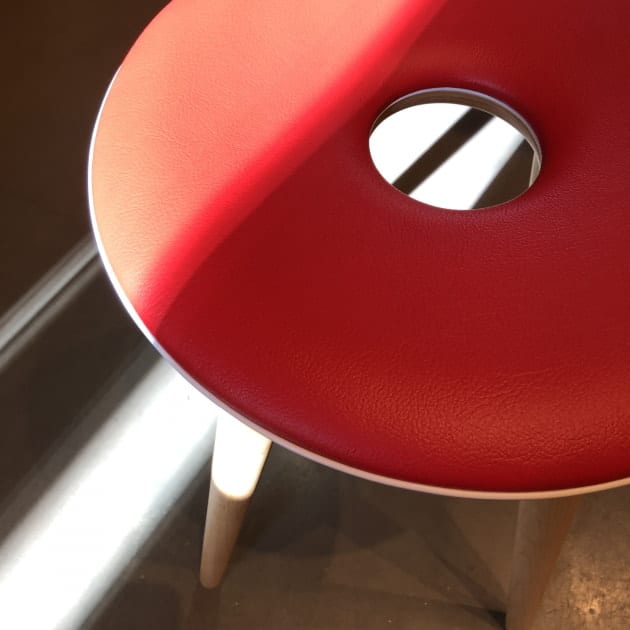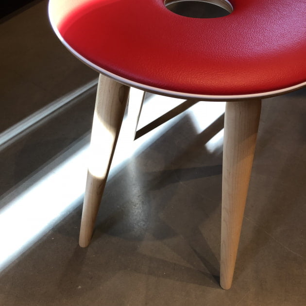 サイドテーブルとしてレイアウトしたのはムライスツール。「第一回天童木工デザインコンテスト」で入賞し後に製品化された田辺(旧姓 村井)麗子によるデザインのスツールです。