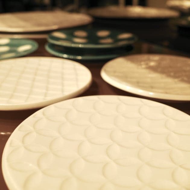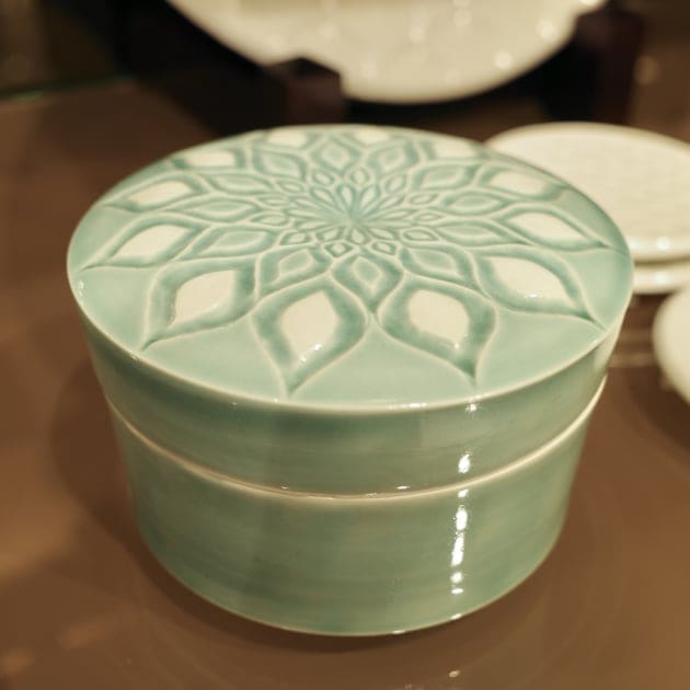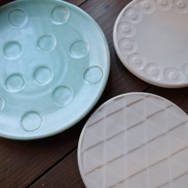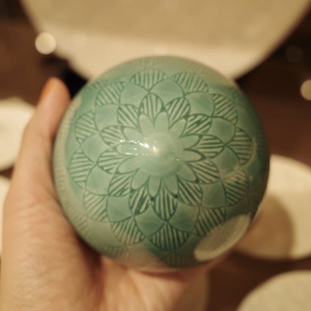 陶器のようにスタンプなどで型押しし難い、硬さのある磁器とあって、一つひとつ丁寧に手彫りで施されています。