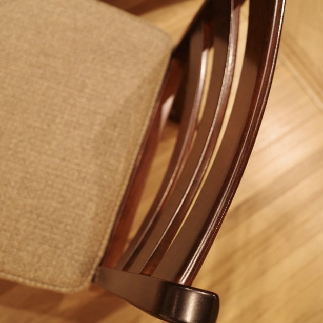 <松本民芸家具>既存の布張り椅子というと光沢あるベルベット生地を連想しますが、ホームスパン調のブラウン生地に乗せ替えることでまた新たな表情に。