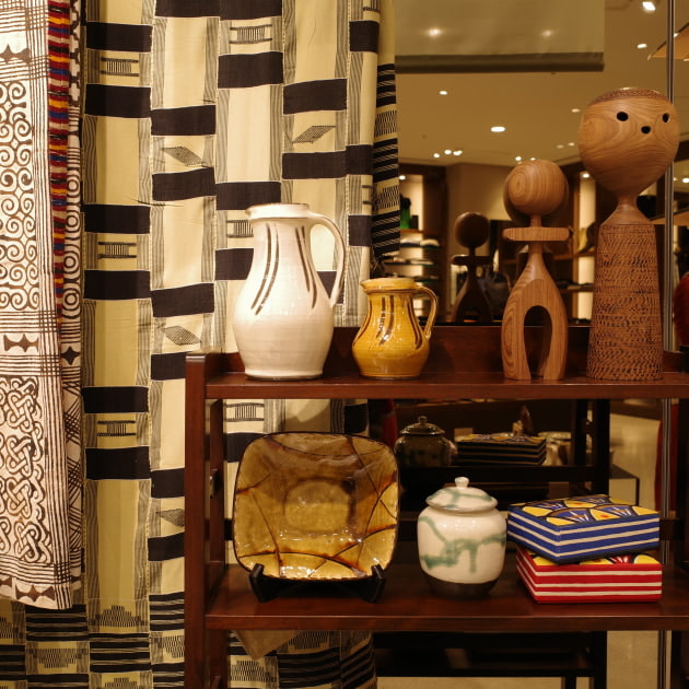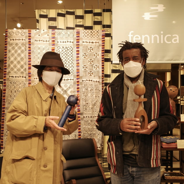 <fennica>定番アイテムを纏ったマネキンとアフリカンクラフト、ジャパニーズモダンデザインファニチャーとがお出迎え。