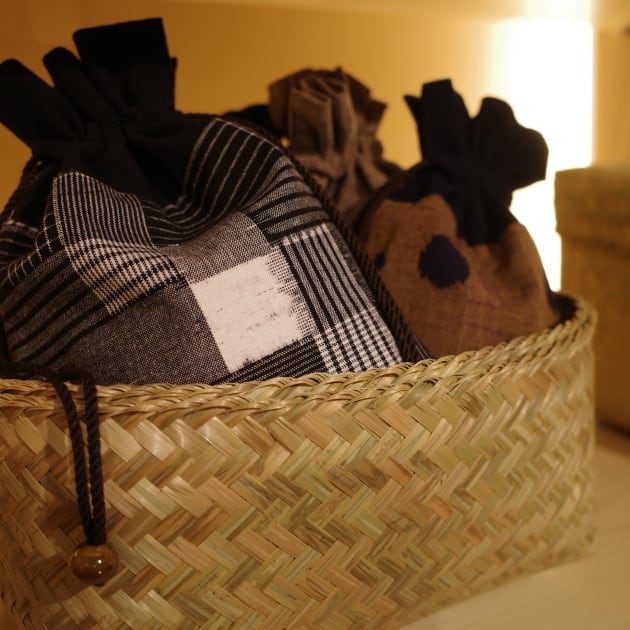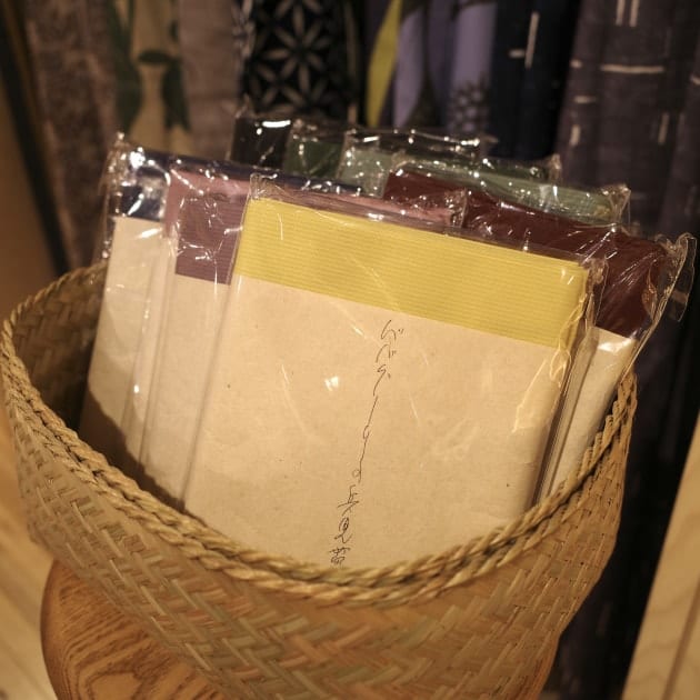 先程のシャツもそうですが、天然染料で染めた後に脱水する際、生地を傷めないように晒袋に入れて脱水機にかけるのだそうで、その晒袋をバッグとしてリメイクした染色工房ならではの副産物なのです。