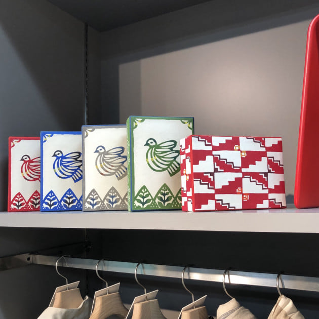 <桂樹舎>のハガキ箱。イエローから透けて見えるグリーンが「Jokapoika」の印刷工程による色の重なりを思わせます。