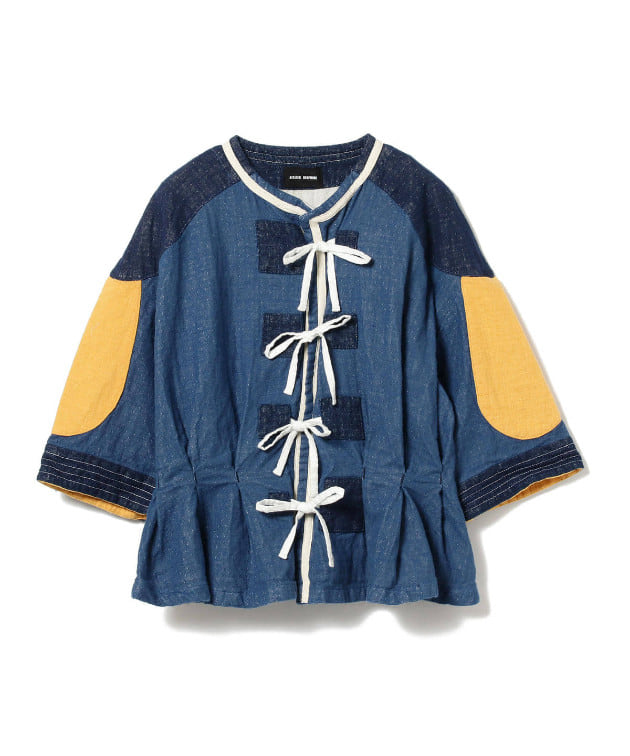 リボン留めのフロントとパッチワークが魅力的なジャケット。