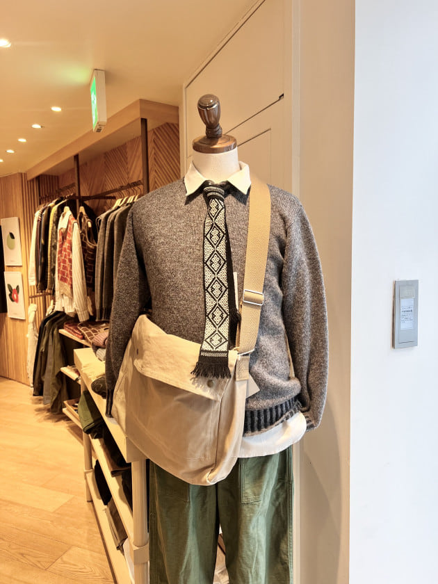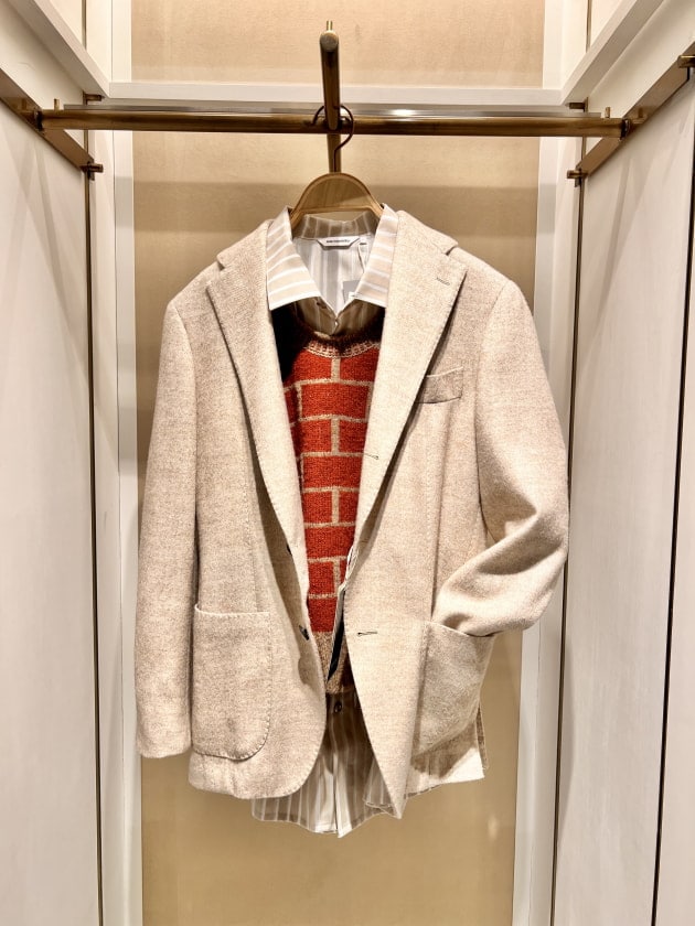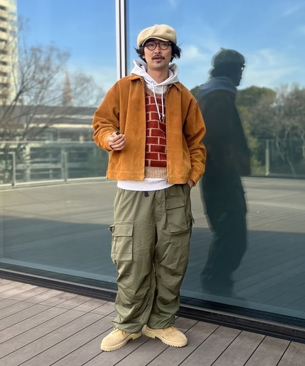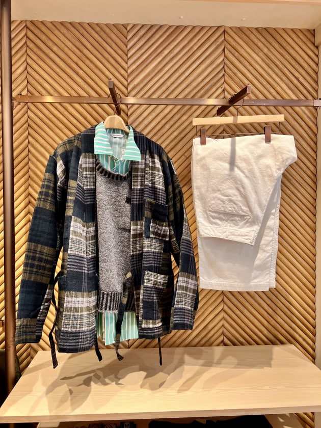 ジャケットからちらっと覗くレンガ柄、この感じならウールのパンツも良いですし、スウェットパンツくらい緩さのある合わせも良いかも。