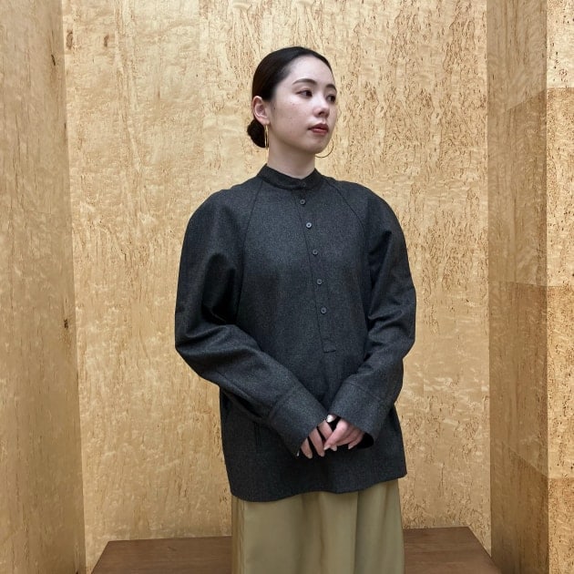 ウールにポリエステルをブレンドした、滑らかな肌触りが魅力の素材。バンドカラーのすっきりとしたデザインに流れるような美しいAラインシルエットが洗練された女性らしさを演出します。