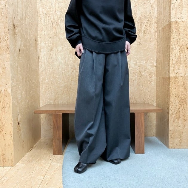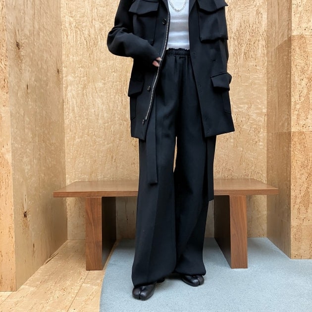ウールギャバジンをベースに、ウエストとサイドにフランネル素材を使用、表情に変化を出した遊び心あふれるデザインです。シンプルなトップスをタックインし、メリハリをつけたり、ゆったりとしたニットをコーディネートし、リラックス感のある雰囲気にまとめるのもお勧めです。