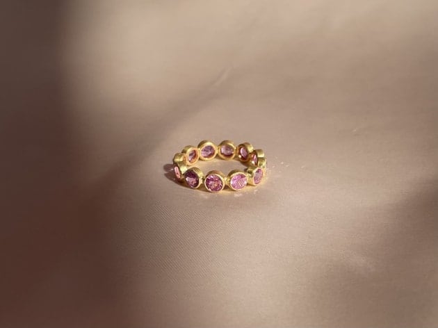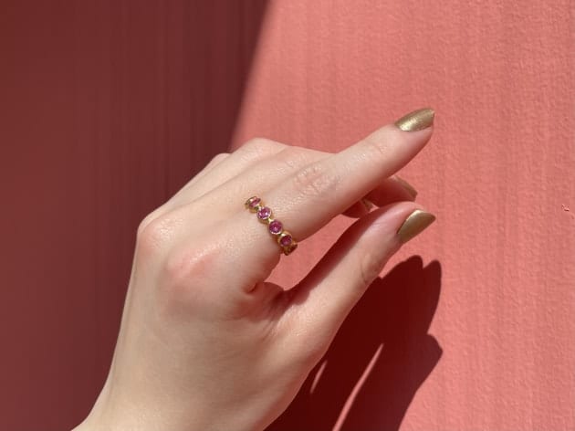 愛らしいリボンモチーフにセッティングされたピンクサファイア。可愛らしさの中に、ゆらゆらときらめく輝きが、華やかさを増します。