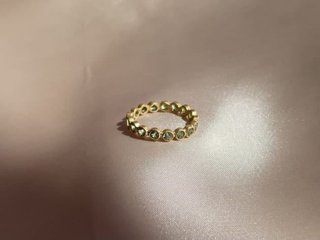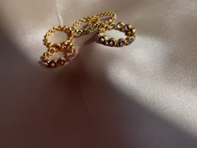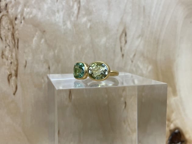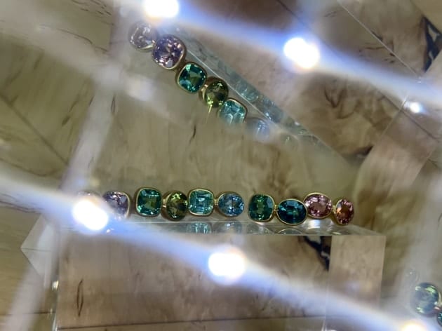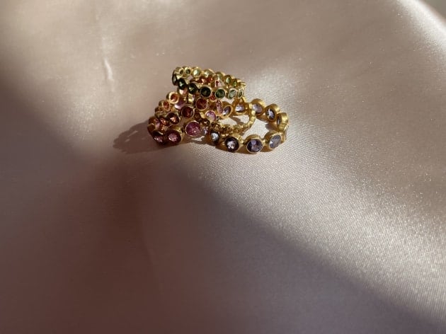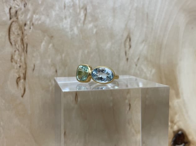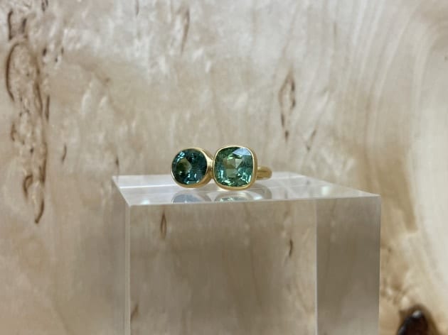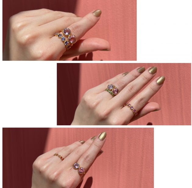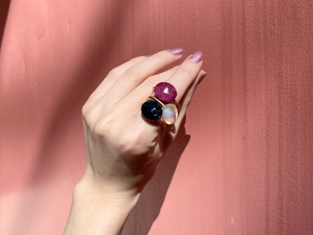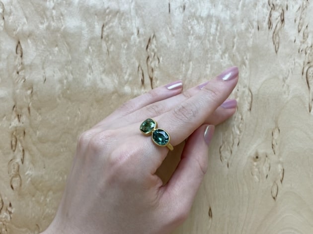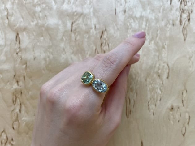 カラーストーンならではの透明感を帯びた色の濃さが瑞々しく感じるトリオリング。中央のアパタイトの鮮やかでクリアなブルーに、サイドに配置されたブルーサファイアによって輝きがプラスされます。ワントーンの中で絶妙に組み合わされたカラーリングを見ると、彼女の繊細で卓越された色彩感覚が伺えます。