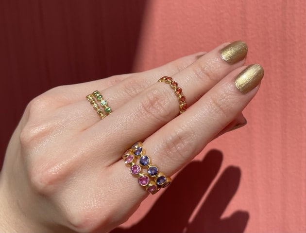 人気の高いボリウッドリング。こちらはお花の様にセッティングされたマルチサファイアがフェミニンなムードを高めます。小粒ながら輝きの強いサファイアは、さりげなく手元を華やかに演出します。