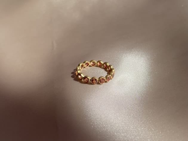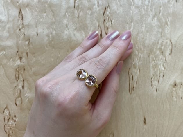 ローズクォーツを使用したこちらのスイヴィルリングは、オーバル型がモダンな印象。透明感と濁りのバランスが均一な石にカットが施され、柔らかい女性らしさの中にも洗練された印象が際立ちます。