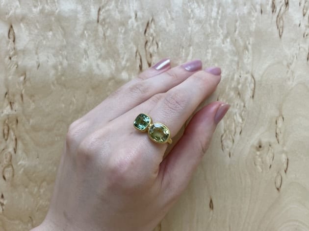 透明度の高いグリーンクォーツは、肌馴染みの良い淡いグリーンが瑞々しいフレッシュな手元を演出します。アンティークジュエリーをオマージュした、洗練されたデザインのMHTを代表するスイヴィルリング。丸みのあるスクエア型も相まって、ボリュームのあるモチーフながら気品溢れるスペシャルなリングとなりました。