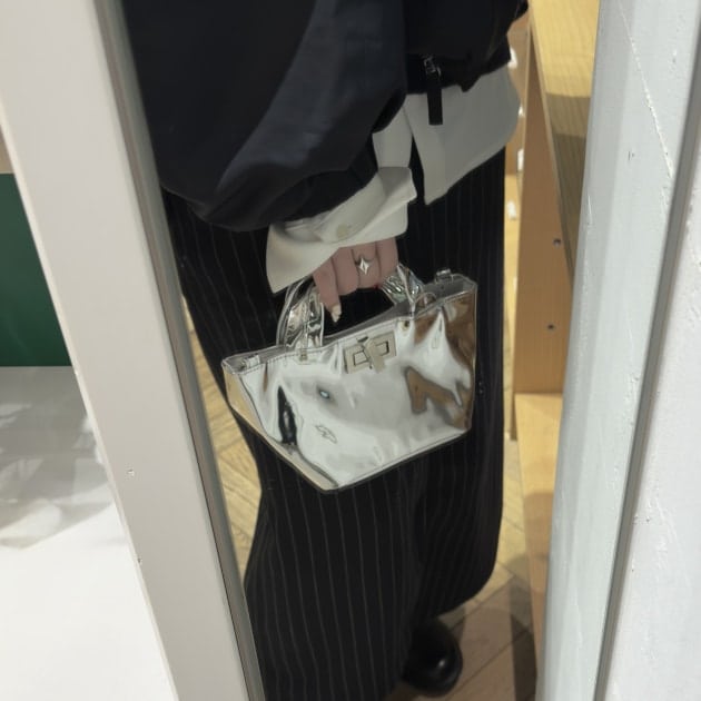 洗練された舟型シルエットのトートバッグ。 輝きを放つミラー素材に、クラシックなターンロック金具がアクセントになってますね。