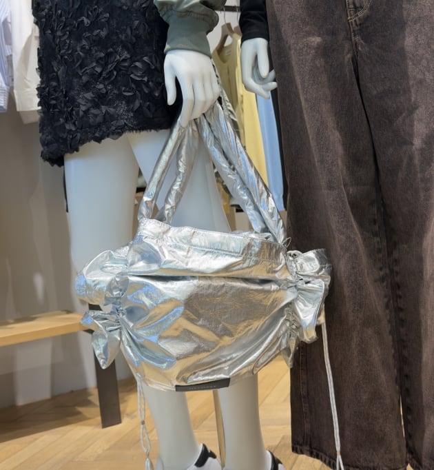 キャンディの包み紙のようなキュートなフォルムと、メタリックな質感が絶妙なバランスのトートバッグ。
