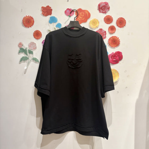前には、ニコッとした顔のデザインがなんともユニーク。シンプルな黒Tシャツに、素敵な遊び心です。