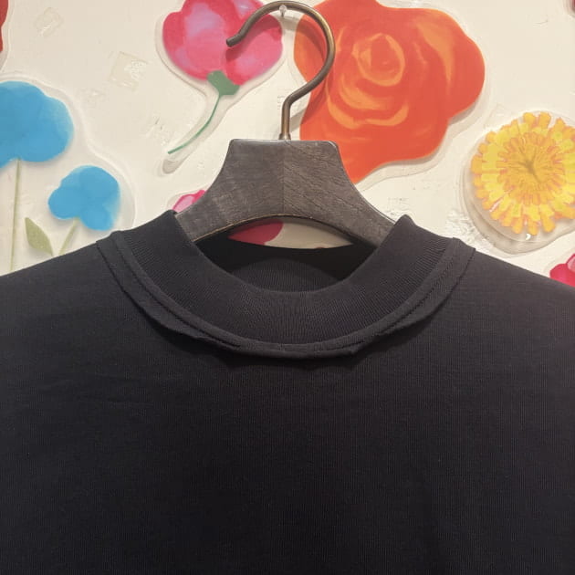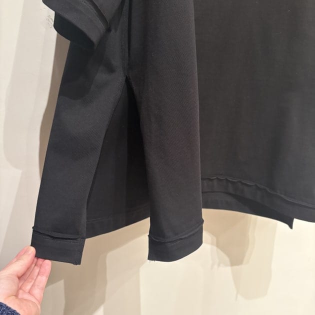 詰まった首元も良いバランスです。切りっぱなしの生地が重ねてあるところもワンポイントになります。