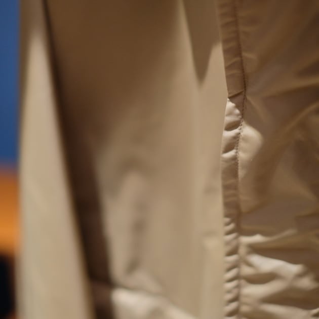見頃やウエストの切替で、ストライプ生地の特性が綺麗に表現されています。