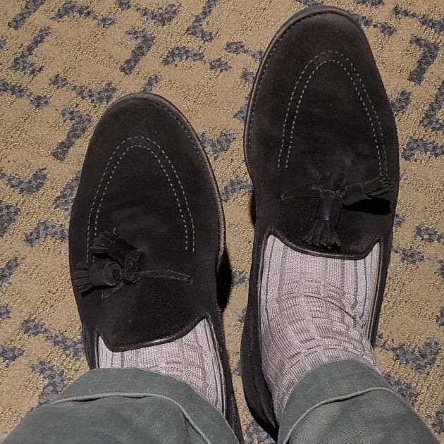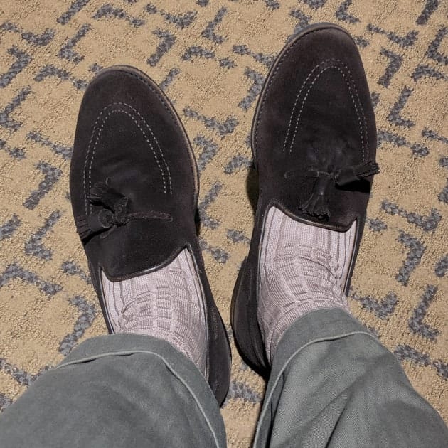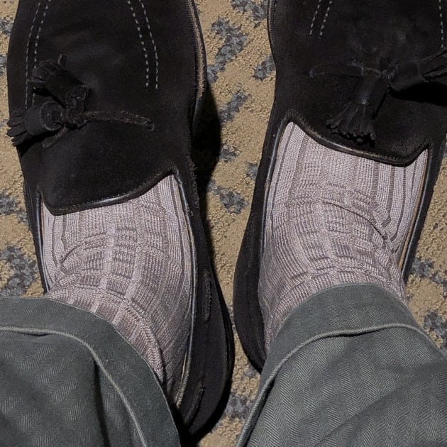 個人的に、ソックスの色合わせは、スーツの時は靴かパンツと繋がる感じがシャープで良く