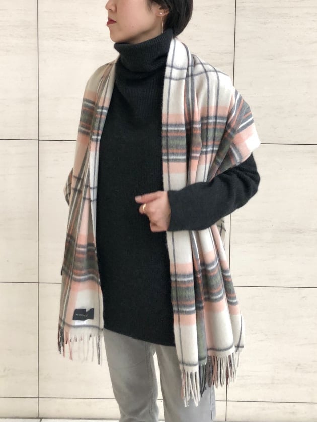 お次はトラッドな雰囲気は男性が持っても良さそうです。飽きの来ないグレーベース。Joshua Ellisの大判カシミヤストールは春はアウター代わりに‥