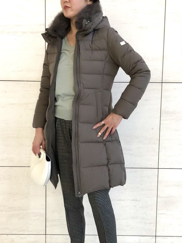 ストレッチ性のあるマットなブラウン。同系色のファーは取り外し可能です。ダウンで着痩せや脚長効果が期待できる秘密は、フォトログもご覧ください。