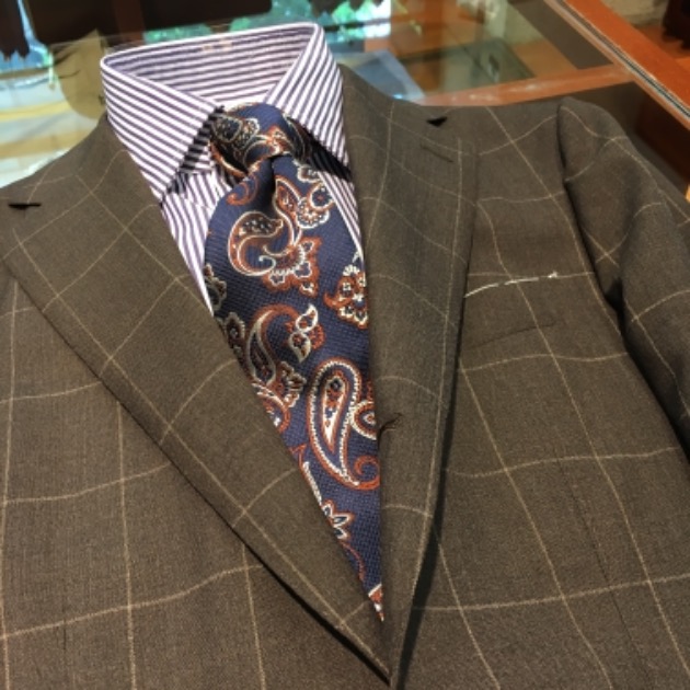 こちらで使用したのは、Ermenegildo Zegna社の生地を用いた、ガンクラブチェックのジャケット。パッと見ると、英国的ながっしりした生地のようですが、とても滑らかなタッチで、イタリア的な上質感も同時に楽しめる秀逸な一着です。