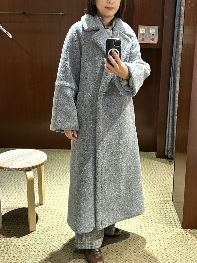 どんどんいきます。こちらは襟元にフェイクファーをあしらったAラインシルエットのモデル。