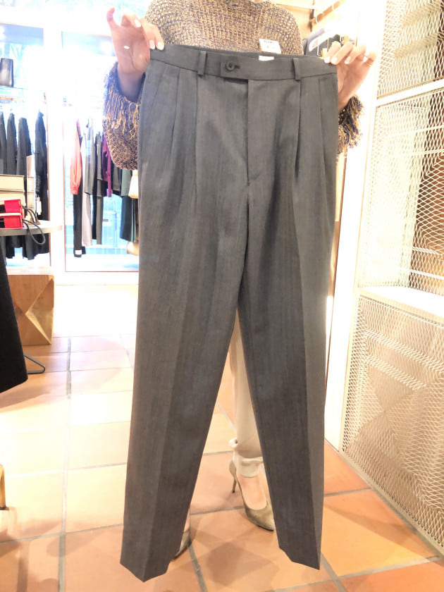 形はシングル三つボタンの組上に、ツーインプリーツでアジャスター付きの組下。気持ちクラシカルなバランスですね。