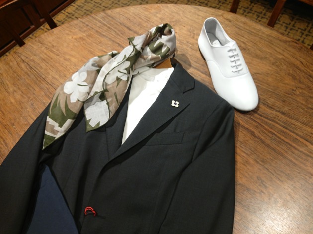 Tシャツやダンスシューズを絡めたコーディネート。イージーなスーツですと、こうした合わせも非常に相性が良いですね。